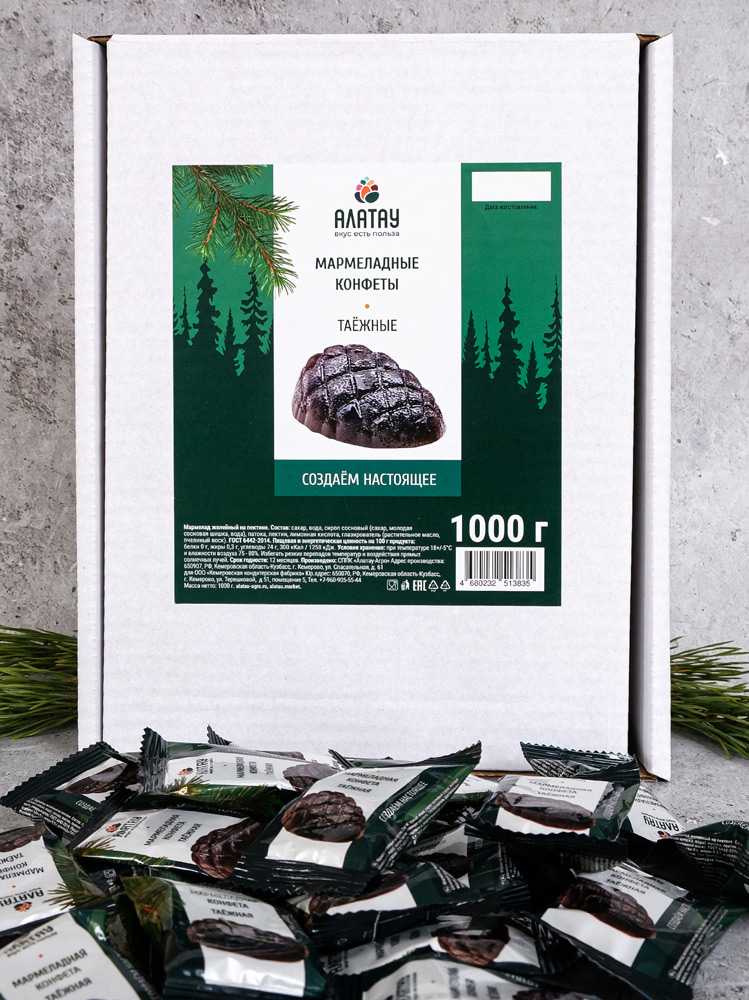 Состав мармелада «Таежный» – сахар, отвар из сосновой шишки, патока, пектин, лимонная кислота, растительное масло, пчелиный воск.